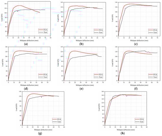 Load–deflection curves between test and FE results. (a) C30R50F1, (b) C45R30F1, (c) C45R50F2, (d) C45R100F1, (e) C45R50F0, (f) C45R50F1, (g) C60R50F1, (h) C45R0F1.