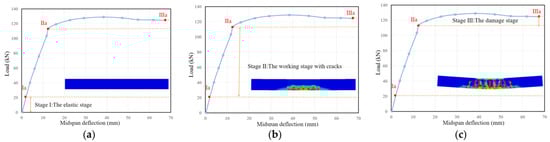 Three stages of beam force and deformation. (a) The elastic stage, (b) the working stage with cracks, (c) the damage stage.