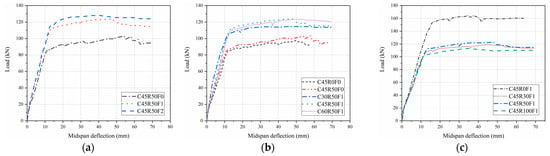 The variation law of the load-midspan deflection is basically the same for each beam. It can be seen from Figure 8 that there are two obvious turning points in the load-midspan deflection curve so that the mechanical and deformation process of the beam specimen can be divided into three stages, the elastic stage, the working stage with cracks, and the damage stage. In the first phase, the concrete in the tensile zone has not yet cracked. The load increases linearly with the increase of deflection. The bending moment and tensile strain of the beam section are small, and the tensile stress and initial stiffness of the tensile zone are shared by the RAC, steel fibers, and longitudinal steel bar. The steel fiber volume fraction, concrete strength, and recycled aggregate replacement ratio have almost no effect on the deformation performance of the beams in this stage. In this stage, the stiffnesses of all beams are close to each other. In the second phase: The phase from after cracking until the longitudinal steel bar yields. The load-deflection curves of SFRAC beams were similar to those of ordinary concrete beams, but the slope of the curve did not change significantly after cracking due to the inhibition of the development of concrete cracks by the incorporation of steel fibers. With the increase of steel fiber volume fraction, the development of cracks was inhibited, so that the ductility of SFRAC beams was well improved. In the third stage: Damage stage. When the damage state was reached, the longitudinal steel bar yields, and the load-deflection was horizontally related. From the yielding of the tensile steel bar to the final crushing of the concrete, the increase in the load was slight, and the increase in the beam deflection was significant, which indicates the good ductility of the beam. Figure 9a shows that the deflection decreases with the increase of steel fiber volume fraction at the same load level. However, the steel fibers in the concrete tend to aggregate when the steel fiber volume fraction is larger than 1.0%. Figure 9b indicates that the stiffness of SFRAC beams tends to increase with the increase of steel fiber volume fraction in the elastic phase and cracking phase, and the ductility of SFRAC beams was better after the yielding of steel bar. Figure 9c illustrates that stiffness tends to decrease with the increase of the recycled aggregate replacement ratio in the elastic phase. The stiffness in the cracking phase was basically unchanged, and the ductility of SFRAC beams was lower than that of ordinary steel fiber concrete beams with the same concrete strength after the steel bar yields.