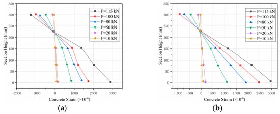 Strain distribution of midspan section along section height. (a) C45R50F1, (b) C45R50F2.
