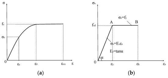 The stress–strain relationship of reinforced concrete structural materials is shown in Figure 12. The stress–strain relationship for SFRAC is based on the constitutive model of SFRAC under uniaxial compression in Gao et al. [34]: