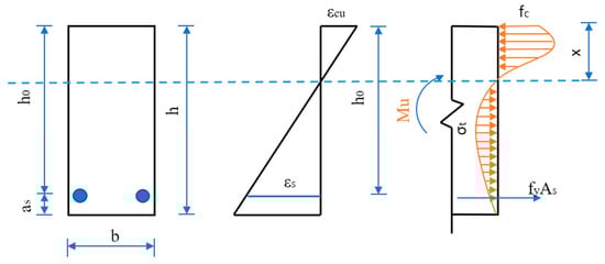The ultimate flexural bearing capacity of concrete beams reinforced with steel fibers depends to a large extent on their mode of destruction. ACI 544.4R-88 [37] provides a calculation method regarding the flexural bearing capacity of reinforced beams based on the mode of destruction of concrete beams reinforced with steel fibers. For beams with crushed concrete damage, the nominal flexural bearing capacity can be calculated by the following equation: