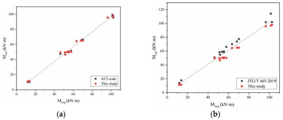 Comparisons between experimental results (Mexp) and predicted values (Mcal). (a) Mexp versus Mcal of this study and ACI code, (b) Mexp versus Mcal of this study and JTG/T 465-2019.