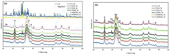 XRD patterns of origin CT5MP powder mixture and cements after 1 (a) and 7 days setting (b) in SBF at 37 °C. (Mg: Mg2P2O7 (JCPDS 32-0626), H: hydroxyapatite (PDF4 01-071-5048), M: monetite (JCPDS 09-0080), T: TTCP JCPDS 25-1137)).