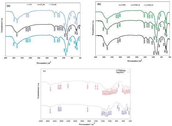 FTIR spectra of (a) CT powder mixture and CT1Si, CT2Si cements after 7 days soaking in SBF; (b) CT5MP powder mixture and CTMP1Si, CTMP2Si cements after 7 days soaking in SBF; (c) CT5MP origin powder mixture before soaking in SBF and Mg2P2O7.
