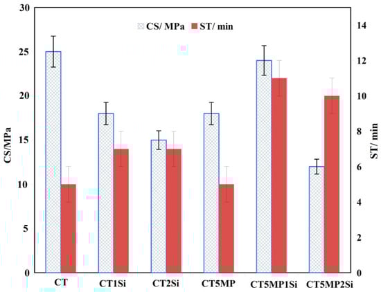 The relative density of the cement was close to 46 ± 2% of the theoretical HAP density, and no statistically significant differences (p > 0.51) were measured between the mean relative density of the samples. In the case of CT, the ST increased from 5 to 7 min by adding nanosilica, but the simultaneous presence of magnesium pyrophosphate actively affected the ST increase in CT5MP up to 10–11 min (Figure 5). On the other hand, the CS (Figure 5) decreased with the concentration of nanosilica in cements from 25 to 15 MPa in CT and CT2Si cements. The addition of 0.5 wt% of nanosilica to CT5MP cement caused an increase in CS from 18 to 24 MPa (statistically significant difference, p < 0.03) for CT5MP and CT5MP1Si cements, while an almost two-fold reduction in CS (up to 12 MPa) was measured in CT5MP2Si containing 1 wt% nanosilica.