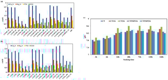 Release of Ca2+, Mg2+, silicate, phosphate ions (a) CT5MP, CT5MP1Si, CT5MP2Si, (b) CT, CT1Si, CT2Si and (c) change of pH during the soaking of cements in SBF at 37 °C.
