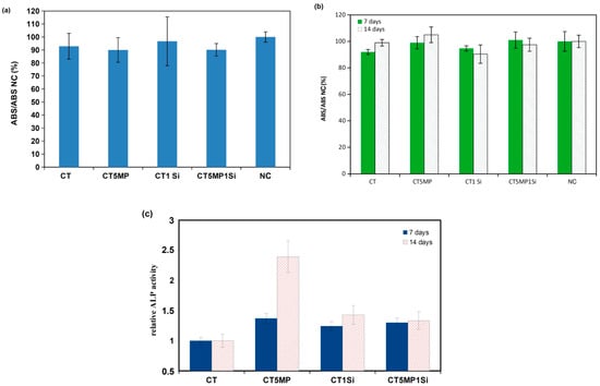 In vitro cytotoxicity of 100% cement extracts was evaluated after 24 h of culture in an osteogenic medium (according to ISO 10993–5:2009 [31]) (Figure 7a). The relative cell viability of MSCs after 24 h of culture in all cement extracts reached >90% cell viability in NC (negative control), indicating their non-cytotoxic nature. A similar conclusion was demonstrated during the long-term culture of MSCs in 50% cement extracts (Figure 7b). A standard assay of ALP activity of MSCs differentiated in an osteogenic medium clearly identified the highest relative ALP activity in cells cultured in CT5MP extract compared with others, where the addition of nanosilica to the cements caused a decrease in ALP activity of the cells. In contrast to this fact, ALP activity culture in an extract of CT cements with the addition of nanosilica was higher than in cells cultured in CT extract (statistically significant difference, p > 0.05); thus, an increase in the content of silicate ions in the extract, even in a small amount, increased the ALP activity of cells by about 30–50% with the time of cultivation (Figure 7c).