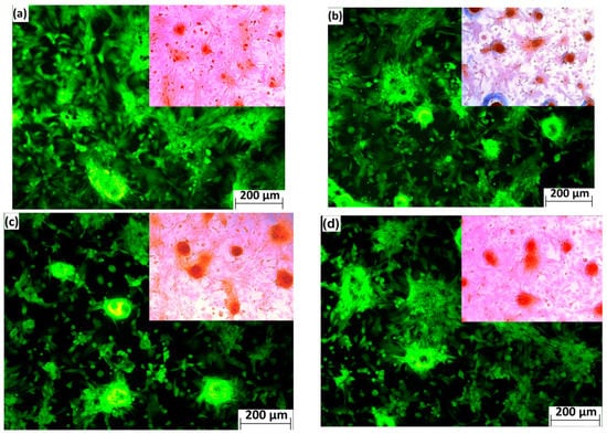 The ALP activity of osteogenic differentiated rat MSCs cultured in long-term extracts was determined in cell lysates. The solutions of equal amounts of cell lysate and phosphatase substrate were incubated at 37 °C for 60 min. The ALP activity was expressed by the amount of p-nitrophenol produced during the ALP enzyme catalysis and was determined using the UV VIS spectrophotometer at 405 nm. The quantification of proteins in lysates was evaluated by Bradford’s assay. Alizarin red staining was used to visualize the production of calcium deposits by differentiated osteogenic cells. Cells in extracts were washed with PBS, fixed in ethanol, and washed twice with dH2O. Deposits were stained with Alizarin red S staining solution for 30 min. After removing the staining solution and washing, the cells were observed under a light microscope (Leica DM IL LED, Heerbrugg, Switzerland).