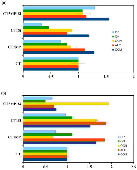 Gene expression RT PCR (Figure 9a) resulted in statistically significant up-regulation (p < 0.001) of ALP and COLI (collagen I) in cells cultured in CT5MP, CT1Si, and CT5MP1Si extracts for seven days compared with cells cultured in CT extract, but the highest overexpression of COLI gene was indicated in cells cultured in CT5MP1Si extract. After fourteen days of culture (Figure 9b), cells cultured in CT5MP and CT1Si cement extracts showed an increase in gene expression and upregulation (p < 0.0002) of COLI and osteogenic genes such as ALP, osteocalcin (OCN), and osteonectin (ON) whereas overexpression of OCN was only measured in cells after fourteen days of culture in CT5MP1Si.