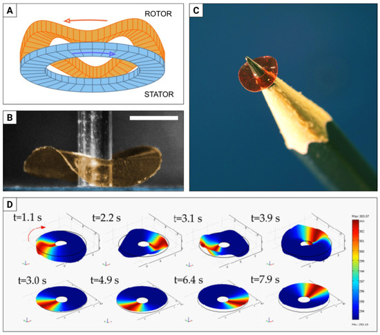 - Dradrach, K.; Rogóż, M.; Grabowski, P.; Xuan, C.; Węgłowski, R.; Konieczkowska, J.; Schab-Balcerzak, E.; Piecek, W.; Wasylczyk, P. Traveling Wave Rotary Micromotor Based on a Photomechanical Response in Liquid Crystal Polymer Networks. ACS Appl. Mater. Interfaces 2020, 12, 8681–8686. [Google Scholar] [CrossRef] [PubMed]