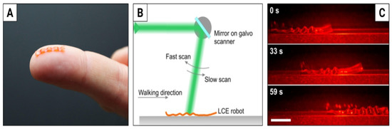 - Pilz da Cunha, M.; Debije, M.G.; Schenning, A.P.H.J. Bioinspired Light-Driven Soft Robots Based on Liquid Crystal Polymers. Chem. Soc. Rev. 2020, 49, 6568–6578. [Google Scholar] [CrossRef] [PubMed]