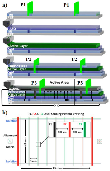 (a) Schematic of OPV device structure with P1, P2 and P3 scribes and (b) laser scribing pattern used for the manufacturing of OPV modules.