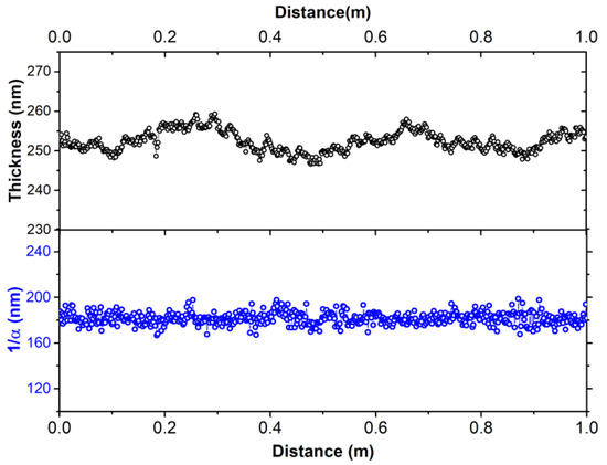 The analysis results from Figure 2 demonstrate a remarkable large area thickness uniformity of the photoactive layer with a mean thickness of 252 ± 3 nm, demonstrating a homogenous, smooth and uniform film deposition. Additionally, the negligible deviation of the 1/α value (181 ± 5 nm) reveals the homogeneity of the layer without defects, impurities or contaminations. As a result, the constant light penetration depth across the web can ensure the effective and reproducible laser patterning as well as the semitransparency and consistent light harvesting properties across the area of the OPV modules.