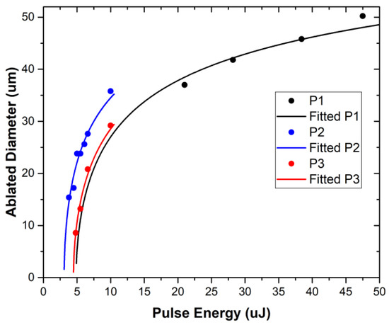 In order to reduce the trial-and-error experimental steps for the optimization of the laser scribing processes, we proceeded to the theoretical calculation of the laser ablation threshold fluence from the relationship between the squared diameter of the ablated spot r2 and the laser fluence F0 (Equation (1)). The laser ablation threshold fluence (FTh) is defined as the minimum laser intensity that enables material removal and is measured as energy/unit area. Typically, an operating laser process is defined as at least at 2 × FTh, and since this parameter is independent of a focused spot size, it is used to compare laser ablations with different focal spot sizes or laser types. FTh can be calculated assuming the well-known Gaussian equation below [29,32,42,43]:
