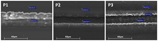 The establishment of the selective ablation of the corresponding layers for each process was verified by SEM imaging and EDX analysis (Table 2). Figure 6 shows the optimum accomplished laser scribes for each laser process, establishing the successful removal of the desired layers without damaging the underlying structure. The P1 optimum scribing quality was achieved at a 78% pulse overlap and 29.4 μJ pulse energy. From the EDX analysis performed within the scribe line, no traces of Indium or Ag were reported, indicating the complete removal of the IMI layer. Moreover, we observed no heat-effect zone or damage delivered to the PET substrate. For P2 laser process, the best scribing quality was achieved with an 87% pulse overlap and a 5.1 μJ pulse energy, and according to the EDX analysis in the scribing line the absence of S, which is a component of the PAL as well as of the PEDOT:PSS layer, both were completely removed and at the same time the existence of In and Ag verified that the transparent electrode in still was undamaged. For the P3 laser process, the optimum laser parameters were found to be the same as for the P2, and the EDX analysis reported no S residues inside the scribe line, announcing efficient ablation not only for the top AgNw but also for the PAL/PEDOT:PSS over the AZO. Here again as for the P2 laser process from the trace of the Ag and In inside the scribe line, it can be concluded that the transparent electrode is still bridging the OPV cells in the module. Nevertheless, from the SEM images of the P2 and P3 laser process, a small delamination at the edges of the scribe line was observed due to lower pulse energy at the edges, as well as a heat effect zone due to the high focal length used in order to achieve a 300 × 300 mm field of view.