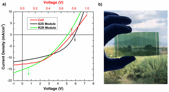 In order to demonstrate the efficiency of the laser scribing process in the manufacturing of fully R2R printed semitransparent OPV modules, a comparison is presented between the performance of single OPV cells with a 1 cm2 active area and S2S and R2R OPV modules with different module lengths consisting of eight interconnected in-series OPV cells with a total active area up to 35.3 cm2. As it is declared in the J-V curves (Figure 7) and the electrical characteristics shown in Table 3, there are negligible power losses at the upscaling of the manufacturing process from a single cell to a fully printed OPV module.