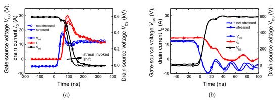 Due to their superior properties, silicon carbide-based (SiC) devices have become the number one choice for power electronic conversion semiconductor (PECS) applications, where they operate under high power, high temperature, and high switching frequency conditions [1,2]. These applications typically employ a high quantity of large-area dies per system while demanding high system-level reliability under aggressive electrical and environmental operating conditions. Significant progress in recent years in the development of SiC transistors and, above all, in their reliability have contributed to the fact that SiC-based devices have become a viable alternative to silicon-based power devices [3]. Nevertheless, before SiC can completely replace silicon (Si) counterparts, robustness and reliability remain the main issue [4,5] for the devices under several extreme operational conditions, such as overcurrent, overtemperature, short circuit, and unclamped inductive switching (UIS) [6]. For example, sudden high currents and voltage pulses may occur during start-up events or load changes of electric motors. Even with a good inverter or power supply design, high-voltage peaks may occur due to inevitable parasitic inductances. As a result, voltage spikes can easily reach the value of the breakdown voltage of the switch, leading to an avalanche breakdown operation for a short time. This imposed stress might trigger the drift of electrical parameters that can limit the devices’ operating range and lifetime. Even though the degradation of device electrical parameters is well studied, the relation to material defects is still unclear and represents a gap in knowledge of SiC-based devices.