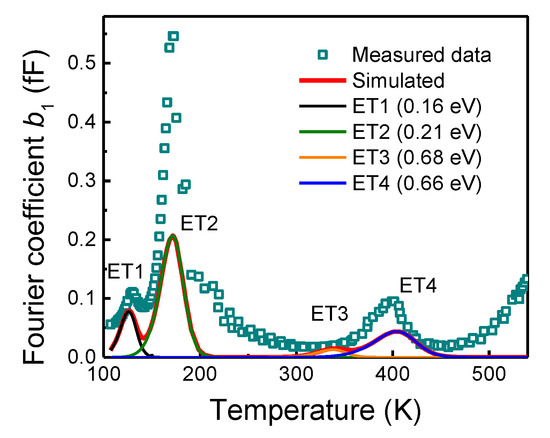 Fourier coefficient, b1, spectrum before the stress. The position of evaluated deep levels is verified by the simulation (solid lines).