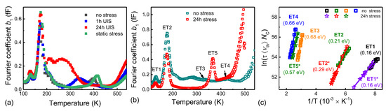 The Fourier coefficient b1’s spectra and Arrhenius plot, shown in Figure 6a, illustrated the static stress effect. As a result, we can summarize these observations: As the spectra for the unstressed virgin device and the device after static stress are almost identical, we can conclude that static stress had minimal impact on the device degradation. On the other hand, both repetitive UIS stress considerably affected the observed spectra. The concentration of the trap ET1 was slightly increasing with the length of UIS stress, while the increase in the trap state ET2 was observed only for the long-term stress (24 h). The highest impact of repetitive UIS was observed on trap states ET3 and ET4. First, after the short stress (1 h), the signal from trap state ET3 was increased. However, the long UIS stress had the opposite effect, and the signal from the trap ET3 was significantly suppressed. Similarly, the signal from trap ET4 is suppressed after the long-term UIS stress. Using different measurement conditions, we identified one newly generated electron trap state, ET5, with an activation energy of 0.57 eV. Since the emission from trap state ET5 is present without signals from ET3 and ET4, we can conclude that it is the first stage of the two-electron process ( transition). Furthermore, we assume that the trap state was activated by the stress conditions because it was observable only after long-term UIS stress.