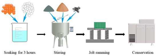 Mixing is a very complex process in the preparation of thermal-insulation concrete. The purpose of mixing is not only to achieve a homogeneous mixing of the materials, but also to consider the homogeneous dispersion of the fibers in the cement matrix. Before making the mortar, the ceramsite and the glazed hollow beads were soaked in water for 3 h to achieve better bonding with the cement. Then, the dry fiber, cement, and sand were mixed thoroughly in a standardized mortar mixer. The moistened ceramsite, glazed hollow beads, and water were gradually added to the mixer until a homogeneous mixture was obtained. The concrete was loaded into the mold and fully compacted on a vibrating table. After the specimens were stripped, they were placed in a curing chamber at 20 ± 2 °C and 98% relative humidity. The process of specimen fabrication is shown in Figure 2. To measure hardening properties, samples of cubes, cone platforms, and cuboids were prepared in sizes (150 × mm 150 mm × 150 mm), (175 mm × 185 mm × 150 mm), and (150 mm × 150 mm × 50 mm), respectively. Cube and cone platform specimens measure apparent density, compressive strength, and impermeability after 28 d curing. Rectangular specimens were used to measure thermal conductivity. The thermal conductivity was measured in wet and dry conditions, when the conservation specimens were maintained for 3 d. The specimens were dried in a drying oven at 50 ± 2 °C for 5 h. The low drying temperature prevented the samples from developing microcracks. The thermal conductivity of the specimens was measured in a moist state at temperatures of 30 °C, 40 °C, 50 °C, and 60 °C.