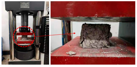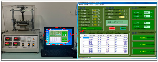 The performance tests of the hardened specimens included the apparent dry density, determined by geometric measurements and weighing. According to “Standard for test method of mechanical properties on ordinary concrete”, the compressive strength of the specimens was measured using an AGX-250 electronic universal testing machine. This tester has a maximum load capacity of 2000 kN and a constant rate of 1 mm/min [25]. The hydrostatic pressure method was used to measure the permeability resistance of the insulating concrete. The impermeability test was carried out according to the “long-term performance and durability of PC method” [26], using a concrete permeability meter of type SS-1.5. We started with 0.1 MPa, held at 0.1 MPa for 2 h, increased to 0.3 MPa, then increased by 0.1 MPa every 8 h. When water seepage occurred on the surface of three of the six specimens, the test was stopped, and the water pressure at that time was recorded. In this study, if the water pressure was increased to 4.0 MPa and the specimen did not seep after 1 h, the sample was split, and the permeation height was measured. Based on the steady-state plate method, the thermal conductivity of the specimens was measured using the DRPL-I thermal conductivity tester, according to “Thermal insulation-Determination of steady-state thermal resistance and related properties-Guarded hot plate apparatus” [27]. The principle of this method is to maintain a stable temperature on the hot surface, heat transfer through the specimen to the cold surface, measure the heat flow transferred, then calculate the thermal conductivity and thermal resistance based on the thickness and heat transfer area of the specimen, and measure the thermal conductivity of the specimen with the DRPL test system. The instrument is shown in Figure 3.
