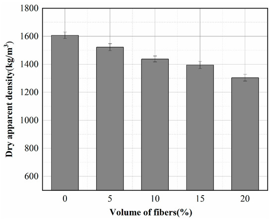 Figure 4 shows the variation of apparent density versus fiber volume for dry concrete. The dry density decreased with the increase of fiber volume. The value ranged from 1607 kg/m3 for concrete without fibers to 1304 kg/m3 for concrete with 20% fibers, a reduction of approximately 18% in dry density. In order to have a fresh cement mortar with good compatibility, the fiber concrete required more water than the reference specimen, resulting in a highly porous matrix during the drying process. In addition, many tiny pores were created around the fibers, reducing the insulating concrete’s density [28]. The first advantage of using basalt fibers for insulating concrete is that it makes the specimen lighter.