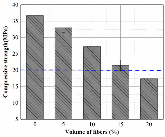 Three sets of concrete specimens of each fiber content were prepared and tested for compressive strength after 28 days of curing, and the average compressive strength values are shown in Figure 5. The minimum value of compressive strength (20 MPa) allowed in the “Standard and Safety Technical Measures for Underground Coal Mine Roadway Grouting” [29] is also marked in Figure 5. It can be seen from Figure 5 that the compressive strength of concrete decreased with the increase in fiber content, and the addition of fiber reduced the compressive strength from 36.7 MPa to 17.4 MPa. The compressive strengths were lower than those of the reference specimen (0%). The compressive strength of concrete with 5% fiber content was closest to the reference specimen, and the strength decreased by 10.1%. The strength of concrete with 20% fiber content decreased by 52.5% and could not even meet the minimum standard of compressive strength. The addition of fiber had a negative influence on the compressive strength of concrete.