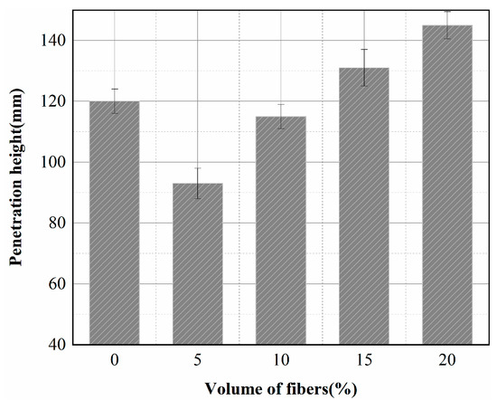 Two sets of concrete specimens with four fiber volume contents were prepared, along with two sets of reference specimens (0%), which were tested for permeability after 28 days of curing. The average values of permeability heights are shown in Figure 7. Figure 7 shows that the permeability height of the insulating concrete does not decrease with the increase of fiber content. Adding 5% and 10% fibers to the reference specimens reduced the permeability height of the concrete by 22.5% and 4.2%, respectively. In contrast, the permeability height of the concrete increased by 9.2% and 20.8% with the addition of 15% and 20% fibers, respectively. The results showed that the best permeability resistance was achieved at 5% fiber content. When the fiber volume content was more than 15%, there was an evident agglomeration phenomenon, which provided a channel for water infiltration and led to a severe decrease in impermeability.