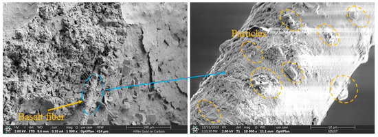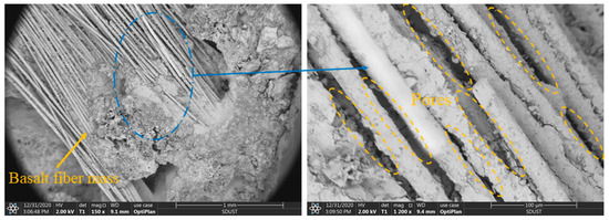 Figure 10 shows the cross-section of the concrete containing 20% fiber. When the fiber volume content was too high, some fibers were not mixed uniformly. They tended to be entangled together, and we observed the formation of basalt-fiber masses in Figure 10. There was little cement content inside the fiber mass, and there was no bonding between the fibers, forming many pores. The agglomerated fibers also attracted moisture from the surrounding area, lowering the water content of other materials, which was not conducive to curing the substrate. The fiber clusters negatively affected the compactness of the concrete and became weak points of strength.