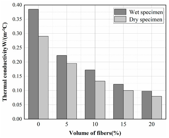 The thermal conductivity of concrete with different fiber contents was generally smaller in the dry state than in the wet state, with the most enormous difference in the reference specimen, with a 24.6% difference in thermal-insulation properties. This can be explained by the high-water content of wet concrete. At normal temperature and normal pressure, the thermal conductivity of liquid water is approximately 22 times higher than that of air. The dry air in the pores is replaced by moist air and water, and the diffusion of water vapor and the movement of water molecules play a major role in heat transfer [32]. Therefore, the greater the water content of concrete, the greater the thermal conductivity. To accurately calculate the thermal load, it is of great significance to consider the thermal conductivity of the humid-state insulation concrete.