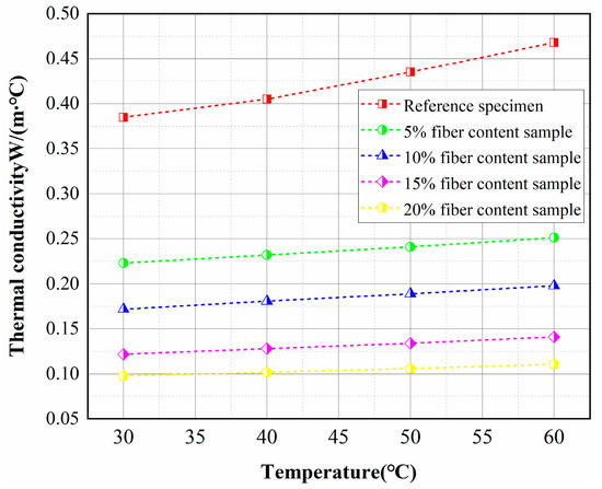 The relationship between the thermal conductivity and the temperature of the concrete specimens in the wet condition is shown in Figure 12. It can be seen that the thermal conductivity of all specimens showed an approximately linear increasing trend with the increase of temperature. An increase in temperature from 30 °C to 60 °C increased the thermal conductivity of the control sample and the 20% fiber-insulated concrete by approximately 21% and 13%, respectively. The increase in temperature intensifies the molecular thermal motion and enhances the three basic modes of heat transfer [33]. The increase in temperature enhances the heat transfer from the concrete solid and the heat convection from the liquid in the pores. In addition, the thermal radiation between the pore walls is enhanced with increasing temperature. However, heat radiation transfers very little heat and can be neglected [34]. Therefore, the thermal conductivity of most materials increases with increasing temperature [35].