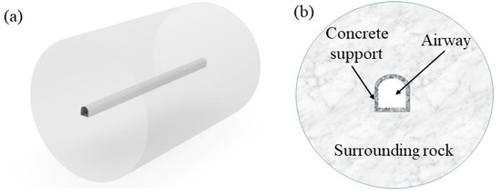 In this study, a section of a high-temperature mine in Shandong Province, China, at a depth of 1150 m below ground with a concentrated flat roadway, was used as the object of the study. The roadway was located in the rock at the bottom of the coal seam and had a service life of ~5 to 7 years. The CFD method was used to study the heat transfer between the surrounding rock–air flow. Specific geometric parameters were measured practically, and a full-size 3D geometric model of the three-centered archway was established by applying Rhino 6.0 software, as shown in Figure 13a. The roadway was 100 m long, 4.9 m high, and 4.6 m wide, with a concrete support layer of 0.2 m and a surrounding rock thickness of 30 m. The model consisted of the air channel, the concrete support layer, and the surrounding rock. Figure 13b shows the model’s cross-sectional profile.