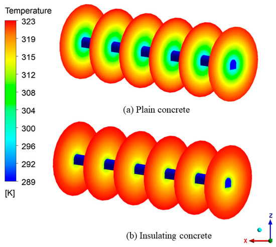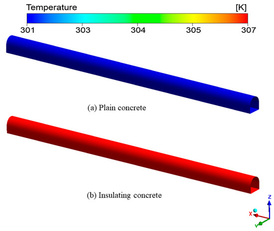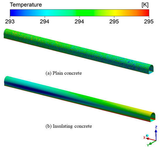 Figure 17 shows the temperature distribution of the roadway wall under different concrete supports. From the entrance to the roadway exit, the temperature was gradually increasing, which may have been due to the strong cooling capacity of fresh air. The wall temperature of under-plain concrete support ranged from 291.6 K to 299.1 K, with an average temperature of 296.4 K. The wall temperature of under-insulated concrete support ranged from 292.6 K to 296.3 K, with an average temperature of 294.5 K. The wall temperature of the roadway with plain concrete was higher, with an average temperature of 1.9 K higher.