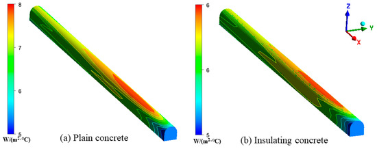 Figure 19 shows the distribution of the convective heat transfer coefficient with the inlet temperature as the reference temperature. From the inlet to the outlet of the roadway, the convective heat transfer coefficient increased rapidly and then stabilized before slowly decreasing. This may have been due to the intense heat exchange between the fresh cold air and the wall. However, as the temperature difference between the wind flow and the surrounding rock decreased along the X-axis, the heat transfer between the surrounding rock and the airflow was gradually reduced. The average value of the convective-heat-transfer coefficient was 7.02 W/(m2·°C), and the maximum value was 7.47 W/(m2·°C) in the area of intense heat transfer under plain-concrete support, which was approximately 30 m. The area of intense heat transfer under the support of insulating concrete, approximately 25 m, had an average convective heat transfer coefficient of 6.01 W/(m2·°C) and a maximum value of 6.42 W/(m2·°C). The convective-heat-transfer intensity between ordinary concrete with larger thermal conductivity and wind flow was more significant, and more heat was emitted from the surrounding rock.