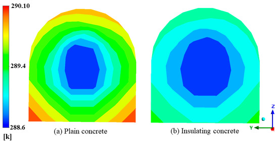 The airflow flows out of the section of the concentrated flat lane and enters the air cooler of the mining work surface. If the airflow temperature is low, the cooling power of the air cooler can be reduced, saving energy. Figure 20 shows the temperature field of the exit airflow from the section-concentrated flat lane. We observed that in both cases, there iwass an unheated circular area (flow layer) at the center of the roadway section where the temperature was kept at 288.65 K, and the other areas had higher temperatures closer to the wall. The radius of the flow layer under plain-concrete support was approximately 1.46 m, the average value of wind flow temperature was 289.29 K, and the maximum value was 290.10 K. The radius of the flow layer under-insulated concrete support was approximately 2.10 m, the average value of wind-flow temperature was 288.99 K, and the maximum value was 289.34 K. The unheated area under-insulated concrete support was much larger, and the average temperature of the exit airflow increased by 0.34 K, compared with the temperature of the inlet airflow (the average temperature of the exit of the roadway under plain-concrete support increased by 0.64 K). The sprayed insulating concrete on the roadway’s surface effectively improved the utilization of the cold volume in the wind flow. It achieved the purpose of reducing the temperature of the wind flow.