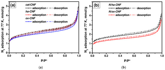 Isotherms of nitrogen adsorption/desorption at 77 K for the studied CNF samples: (a) as-prepared and pretreated CNFs and (b) N-functionalized CNFs. The samples were treated in a vacuum (1 Pa) at 250 °C for 20 h.