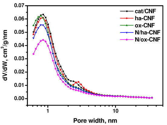 The pore size distributions calculated by the QSDFT method are shown in Figure 2. As seen, all the samples were characterized by the presence of micropores of ~0.8 nm in width. The samples cat/CNF and ha-CNF also contained small mesopores of 2–3 nm in width. It is evident that the post-functionalization with melamine changed the pore size distribution. Thus, the number of pores of 0.8 nm in size decreased noticeably. It is interesting to note that the pretreatment with hydrochloric acid led to a slight shift of the distribution peak at ~2 nm towards higher sizes without a significant change in its value.