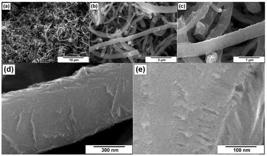 SEM images of the N/ha-CNF sample at various magnifications: (a) 3000×, (b) 10,000×, (c) 30,000×, (d) 60,000×, and (e) 100,000×.