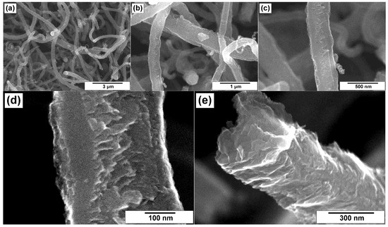 On the contrary, pretreatment by heating in a mixture of sulfuric and nitric acids resulted in loosening of the outer surface of CNFs, thus making them more rough (Figure 5c,d). Figure 5e illustrates the packing character of the flakes within the fiber’s body with eliminated metal particle of the catalyst. Nevertheless, the structure integrity of initial CNFs was not broken during such a drastic conditions of the oxidative treatment.