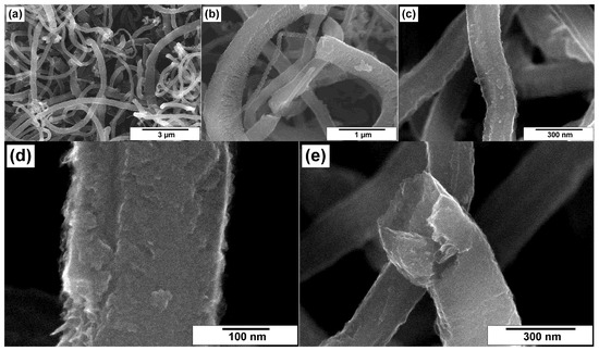 SEM images of the ox-CNF sample at various magnifications: (a) 3000×, (b) 10,000×, (c) 30,000×, (d) 60,000×, and (e) 100,000×.
