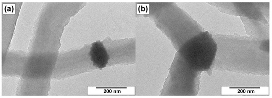 Transmission electron microscopy gives more detailed information regarding the morphological and structural features of CNFs. Therefore, the samples were examined by this method as well. The resulting TEM images are collected in Figure 7, Figure 8 and Figure 9.