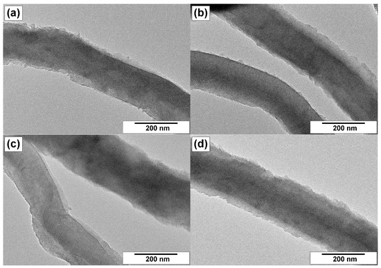 Scanning electron microscopy (SEM, JEOL, Tokyo, Japan) studies of CNFs were performed using a JSM-6460 electron microscope (JEOL, Tokyo, Japan) at a magnification of 1000–100,000×. The morphology of CNFs was examined by transmission electron microscopy (TEM, Hitachi High-Technologies Corp., Tokyo, Japan) using an Hitachi HT7700 TEM (Hitachi High-Technologies Corp., Tokyo, Japan) working at an acceleration voltage of 100 kV and equipped with a W source.