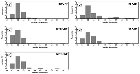 CNF diameter distributions depending on the treatment conditions (based on SEM and TEM data): (a) cat/CNF, (b) ha-CNF, (c) N/ha-CNF, (d) ox-CNF, and (e) N/ox-CNF.