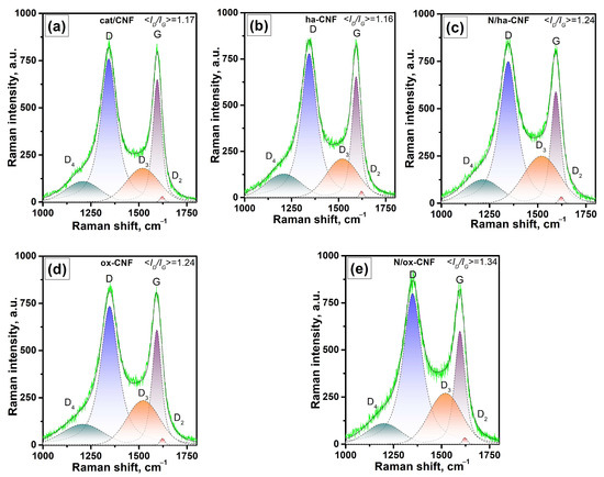 Raman spectra in a region of the first order bands: (a) cat/CNF (b) ha-CNF, (c) N/ha-CNF, (d) ox-CNF, and (e) N/ox-CNF.