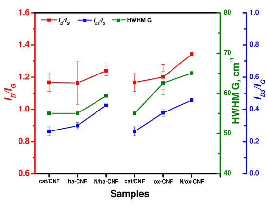 The changes of the main parameters (ID/IG, HWHM G, and ID3/IG) resulting from the pretreatment and post-functionalization of CNFs are shown in Figure 12. Note that each value is an average for four points. As seen, the pretreatment of the initial cat/CNF sample in hydrochloric acid led to an insignificant increase in the portion of amorphous carbon (ID3/IG). The oxidative treatment in a mixture of sulfuric and nitric acids (ox-CNF sample), in addition to an increase in the ID3/IG ratio, also increased the HWHM G value and the ID/IG ratio. This indicates a higher number of defects along with an increased portion of crystalline carbon. In other words, this acidic treatment procedure decreased the portion of disordered carbon on the surface of CNFs. In should be noted that a similar effect of etching-out the disordered carbon from the surface of carbon paper using a solution of sulfuric acid being accompanied by an increase in the ID/IG ratio has been reported in the literature [72]. However, the authors interpreted this change in the ID/IG ratio oppositely—as an increase in the disorder degree of carbon, which is the only explanation if no analysis of the HWHM G parameter and no approximation of the La value are considered.