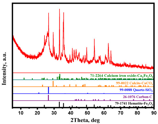 In this study, a gas mixture consisting of CO, CO2, H2, and N2 with a purity of >99.9% was used. BF dust and Na2SO4 analytical reagent were used as raw materials. The BF dust was collected from Shandong Iron and Steel Group. Table 1 shows the main chemical composition of BF dust, in which the contents of Fe, C, SiO2, Al2O3, and CaO are 32.25%, 34%, 6.03%, 2.95%, and 4.03%, respectively. According to the results of Table 1 and Figure 1, there is a large amount of carbon, abundant carbonas (CaCO3), and a small number of sulfides. In addition, a small amount of limonite and magnesium carbonate may exist in the BF dust. As the result, LOI is up to 37.25%. The BF dust is fine, with 100% passing through 0.075 mm. The X-ray diffraction (XRD) pattern of BF dust (Figure 1) shows that the main iron-bearing mineral is Fe2O3 and the main gangues are calcite and quartz.