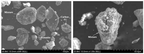 The morphology of a BF dust particle under scanning electron microscope (SEM) is shown in Figure 2. The hematite, carbon, and mixture particles were identified by energy-dispersive spectrometry (EDS). It is clear that some hematite and carbon particles are individual particles, which may be easy to separate after carburization. However, some particles are mixture particles, which is mainly composed of carbon, hematite, calcium iron oxide, quartz, calcite, and so on. These mixture particles are very likely to be formed under a high-temperature process inside a blast furnace. Owing to the high-temperature function, the iron minerals, carbon, and gangue combine closely inside mixture particles, which leads to difficult in the separation and purification of iron minerals and carbon.