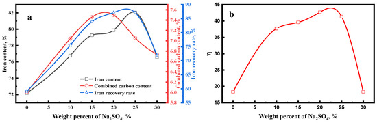 Effect of Na2SO4 on the (a) magnetic concentrate and (b) carburization index of carburized pellet (carburized at 650 °C for 150 min).