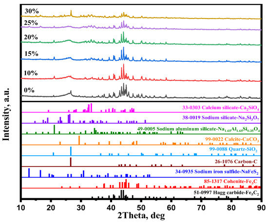 The research [28] found that Na+ ion doping can induce the lattice distortion of iron minerals. Lattice distortion improves the diffusion of iron and carbon atoms, as demonstrated by Abdrakhimov et al. [29]. The rapid diffusion of iron and carbon atoms promoted carburization reactions (Equations (7) and (8)). As shown in Figure 5, the main iron mineral diffraction peaks were Fe3C and Fe5C2 without Na2SO4 additive, whereas the diffraction peak intensity of Fe3C significantly decreased and the diffraction peak intensity of Fe5C2 dramatically increased when Na2SO4 was added. It is clearly found that Na2SO4 significantly improved Equation (8). Therefore, the carburization index significantly increased when adding Na2SO4.